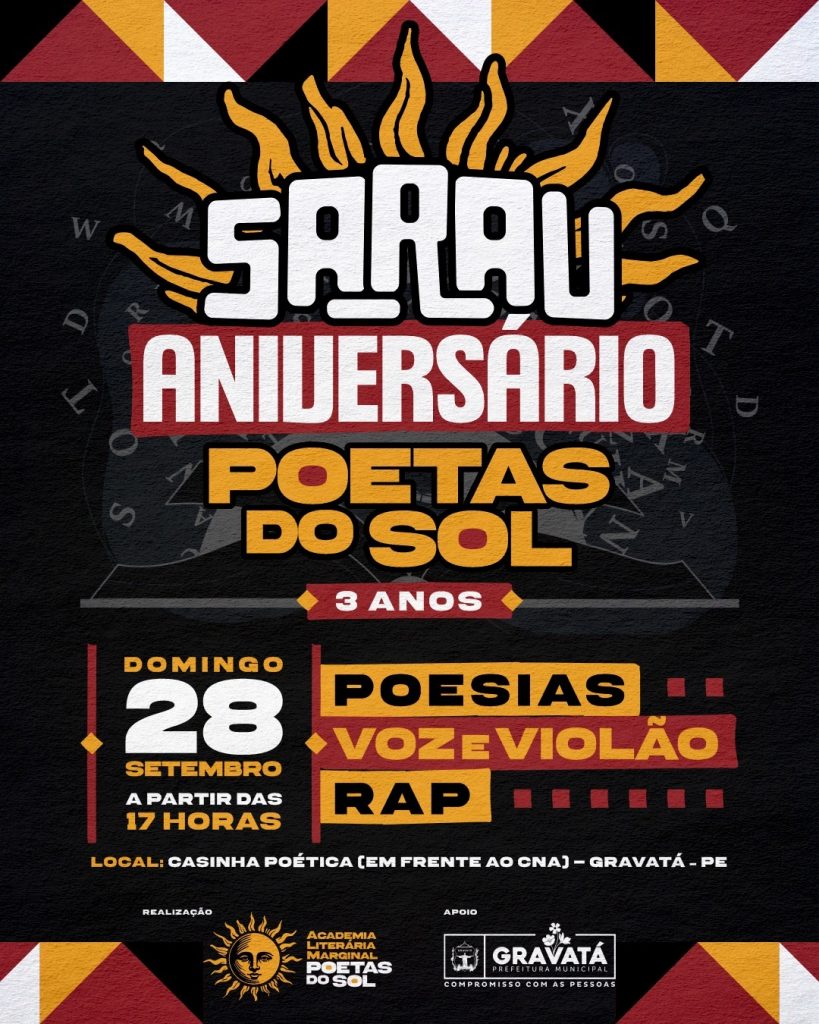 A Academia Literária Marginal Poetas do Sol celebra seus três anos de fundação com um Sarau especial, que acontecerá no próximo dia 25 de setembro, na Vila Turística, localizada na Avenida Joaquim Didier, a partir das 18h30. O encontro promete reunir amantes da poesia, literatura e cultura popular em uma noite de celebração e expressão artística.