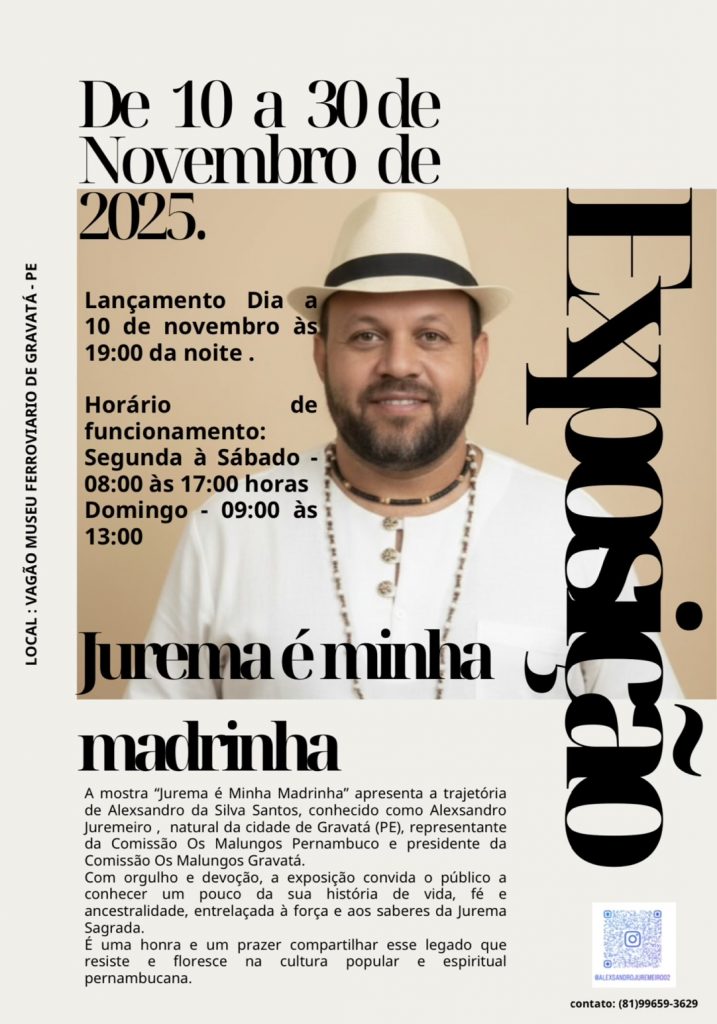 De 10 a 30 de novembro de 2025, o Vagão Museu Ferroviário de Gravatá recebe a exposição “Jurema é Minha Madrinha”, de autoria do artista Alexsandro da Silva Santos. A mostra integra as ações do Novembro Negro, mês dedicado à valorização da identidade e da cultura afro-brasileira.