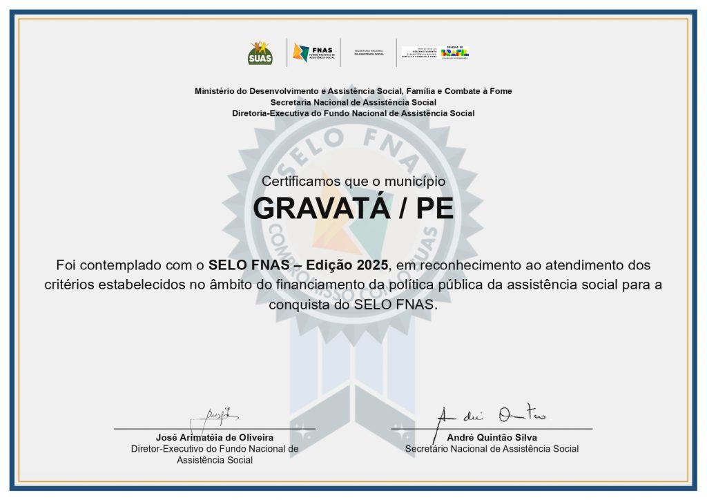 Gravatá está entre os 56 municípios de Pernambuco que conquistou o Selo de Qualidade da Gestão Financeira do Sistema Único de Assistência Social (SUAS), concedido pelo Fundo Nacional de Assistência Social, um importante reconhecimento nacional que atesta a boa gestão dos recursos públicos destinados à política de Assistência Social.