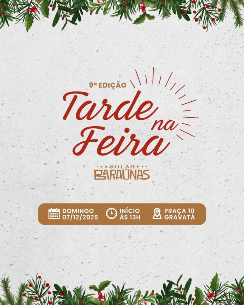 A 9ª edição do Tarde na Feira acontecerá no dia 7 de dezembro de 2025, a partir das 13h, na Praça 10, reunindo artesanato, moda, gastronomia, música e diversas expressões da economia criativa de Gravatá. O evento proporciona experiências únicas para o público e fortalece o trabalho de empreendedores locais.