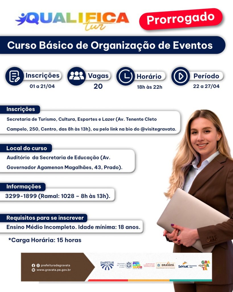 Devido a alta procura, a Prefeitura de Gravatá prorrogou as inscrições para cursos gratuitos do programa Qualifica Tur, uma iniciativa da Secretaria Municipal de Turismo em parceria com o Governo de Pernambuco, por meio da EMPETUR e do SENAC, com o objetivo de ampliar a qualificação profissional no setor turístico, área considerada estratégica para geração de emprego e renda no estado.