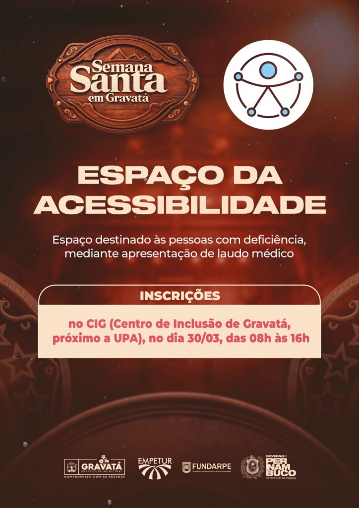 A Prefeitura de Gravatá, por meio da Secretaria de Assistência Social e Juventude, divulga informações sobre as inscrições para acesso ao Espaço da Acessibilidade durante os shows do período da Semana Santa de 2026.