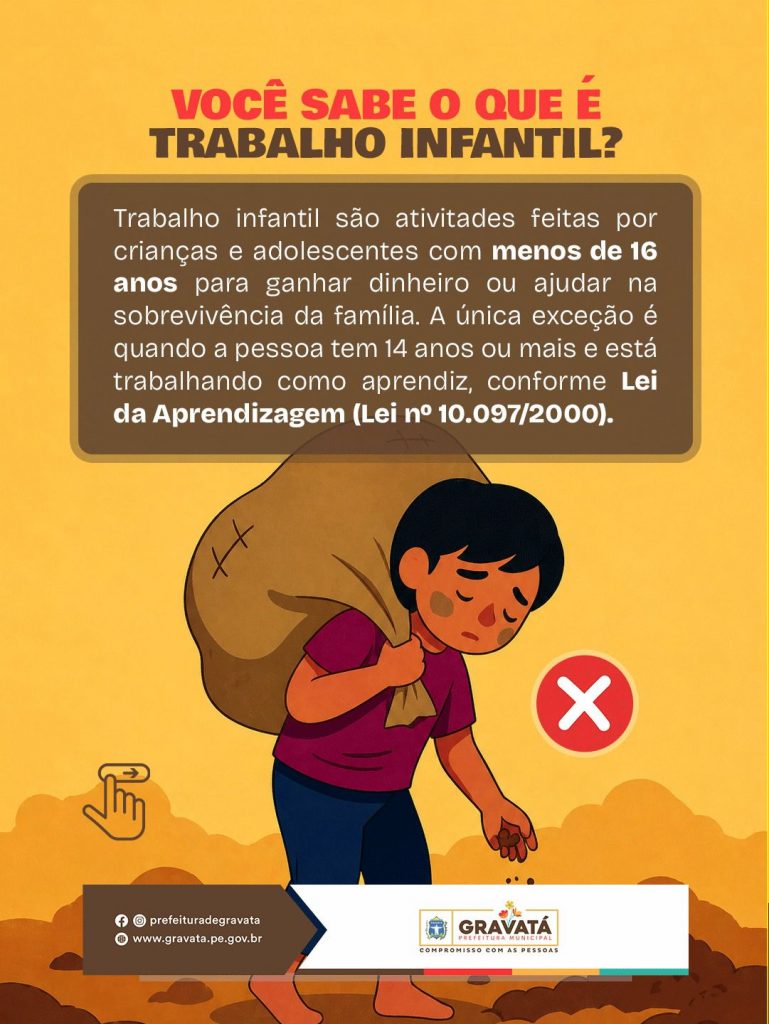 Você sabe o que caracteriza o trabalho infantil? São atividades realizadas por crianças e adolescentes com menos de 16 anos, com o objetivo de gerar renda ou auxiliar na sobrevivência familiar. A única exceção garantida por lei é a condição de aprendiz, a partir dos 14 anos.