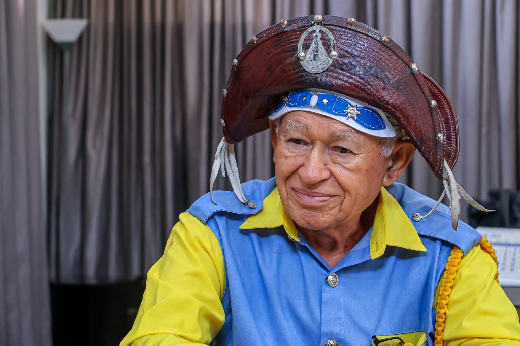 José Antônio de Lima, conhecido como Zé Teixeira, é o comandante da Associação dos Bacamarteiros de Gravatá, que atualmente conta com mais de 20 integrantes. O homenageado conta um pouco da história dele. “Eu desde criança que eu acompanhava meu pai, que ele era bacamarteiro e ele não deixava eu atirar, porque era um garoto com 10 para 12 anos. Mas eu acompanhava todos os festejos que naquela época eram feitos lá do sítio e eu acompanhava esse grupo. Aí meu pai foi ficando mais cansado e eu fui crescendo, ficando forte, daí tomei conta da arma que ele atirava com aprovação do meu pai. Um colega me acompanhava e aí eu rodava, a pé, 23 km pra ir pra casa de pessoas para fazer festa. E assim foi até que, em 2004, com a lei que tinha que registrar as armas, pelo Exército, aquela coisa e toda e então ela foi registrada oficialmente em 2004. Aí entra bacamarteiro, sai bacamarteiro, uns morreram, e eu continuei hoje até hoje graças a Deus. Eu recebo esta homenagem com satisfação, muita alegria. Eu tenho muita honra e represento Gravatá no norte, sul, leste e oeste. Faz 15 dias que a gente estava no Sertão Central, lá perto de Salgueiro, a 420 km, e a gente vai participar agora no dia 02 de maio a gente tá indo para Capela, em Sergipe”.