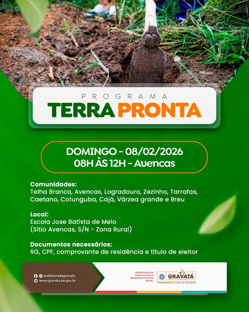 A Prefeitura de Gravatá, por meio da Secretaria de Agricultura e Desenvolvimento Rural, realiza no próximo domingo (08/02) o cadastro de agricultores no âmbito do Programa Terra Pronta, que tem como objetivo garantir a aração de terras para pequenos produtores rurais do município. A ação acontece das 08h às 12h, na Escola José Batista de Melo, no distrito de Avencas.