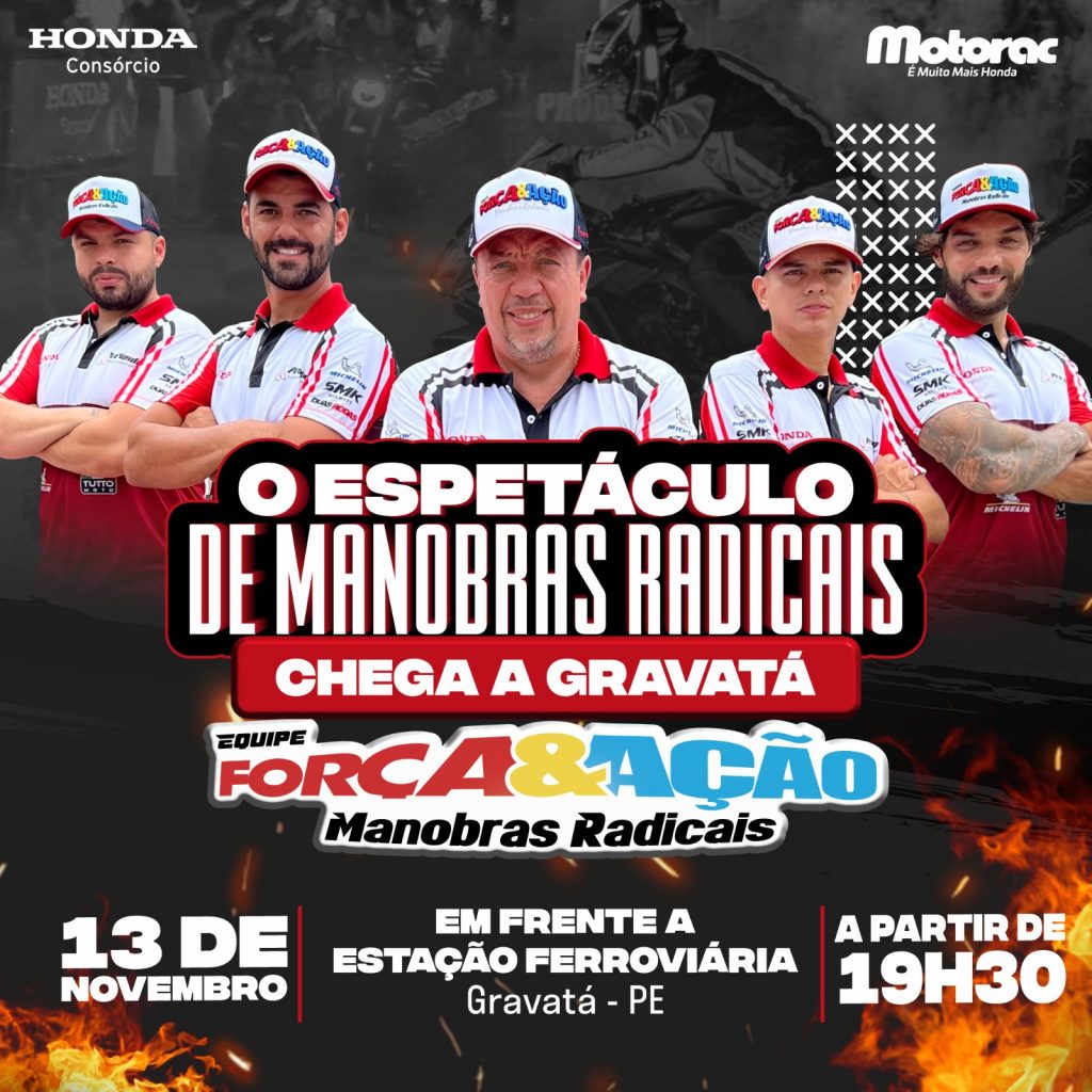 A cidade de Gravatá vai receber, na quinta (13), às 19h30, no estacionamento da Estação Ferroviária, o Show de Manobras Radicais em Motocicletas.